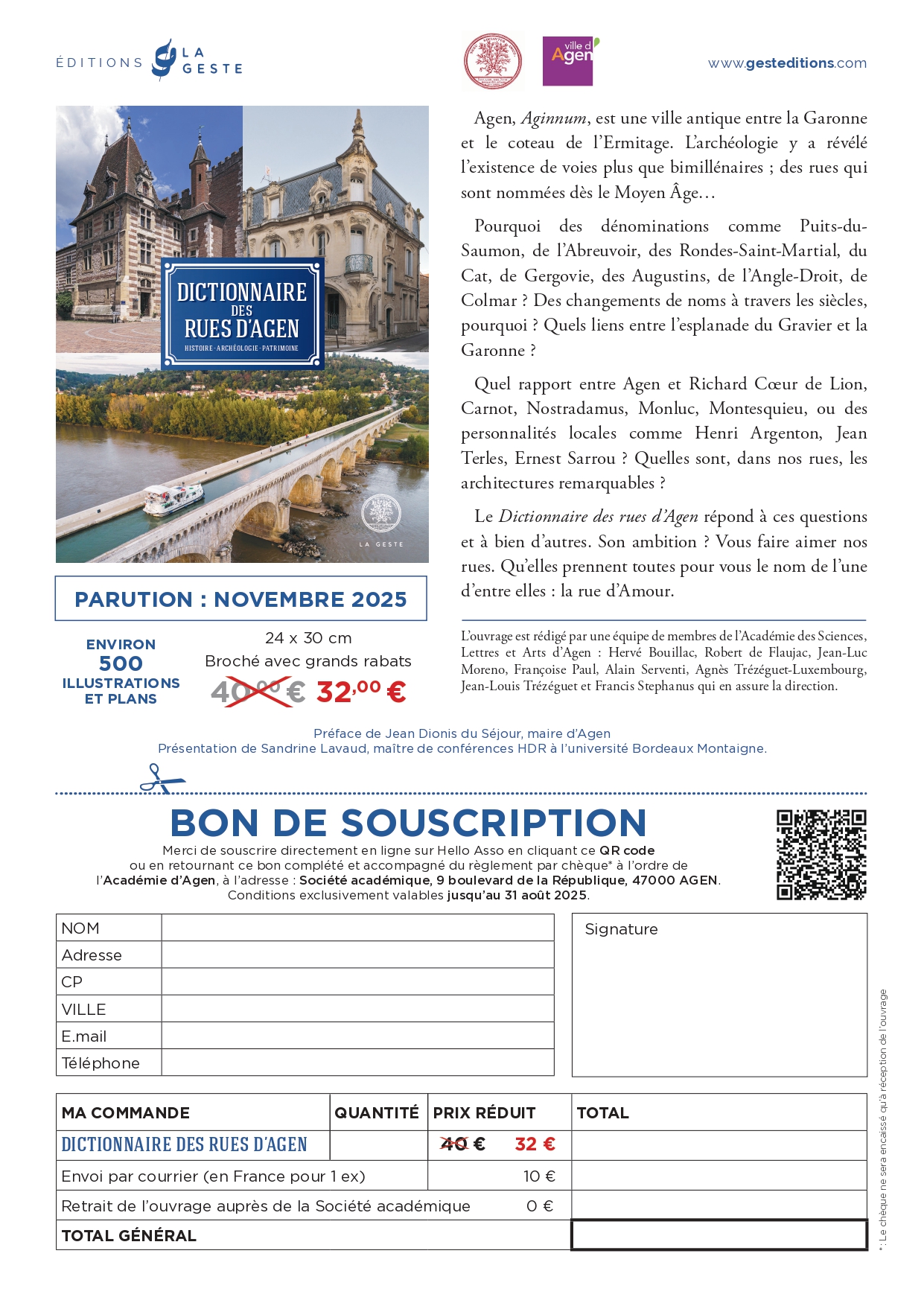 L’ouvrage est rédigé par une équipe de membres de l’Académie des Sciences, Lettres et Arts d’Agen qui vous propose un bon de souscription valable jusqu’au 31 août 2025.