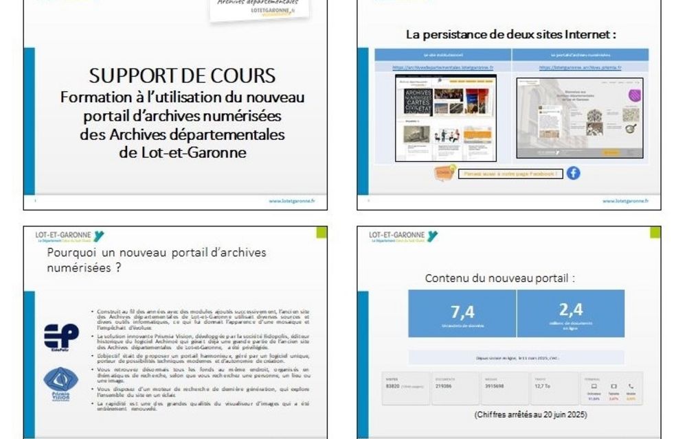 Les 25 et 26 juin 2025, ont eu lieu des formations à l’utilisation du nouveau portail d’archives numérisées des Archives départementales de Lot-et-Garonne que nous vous avions annoncées sur notre site Internet et notre page Facebook.
