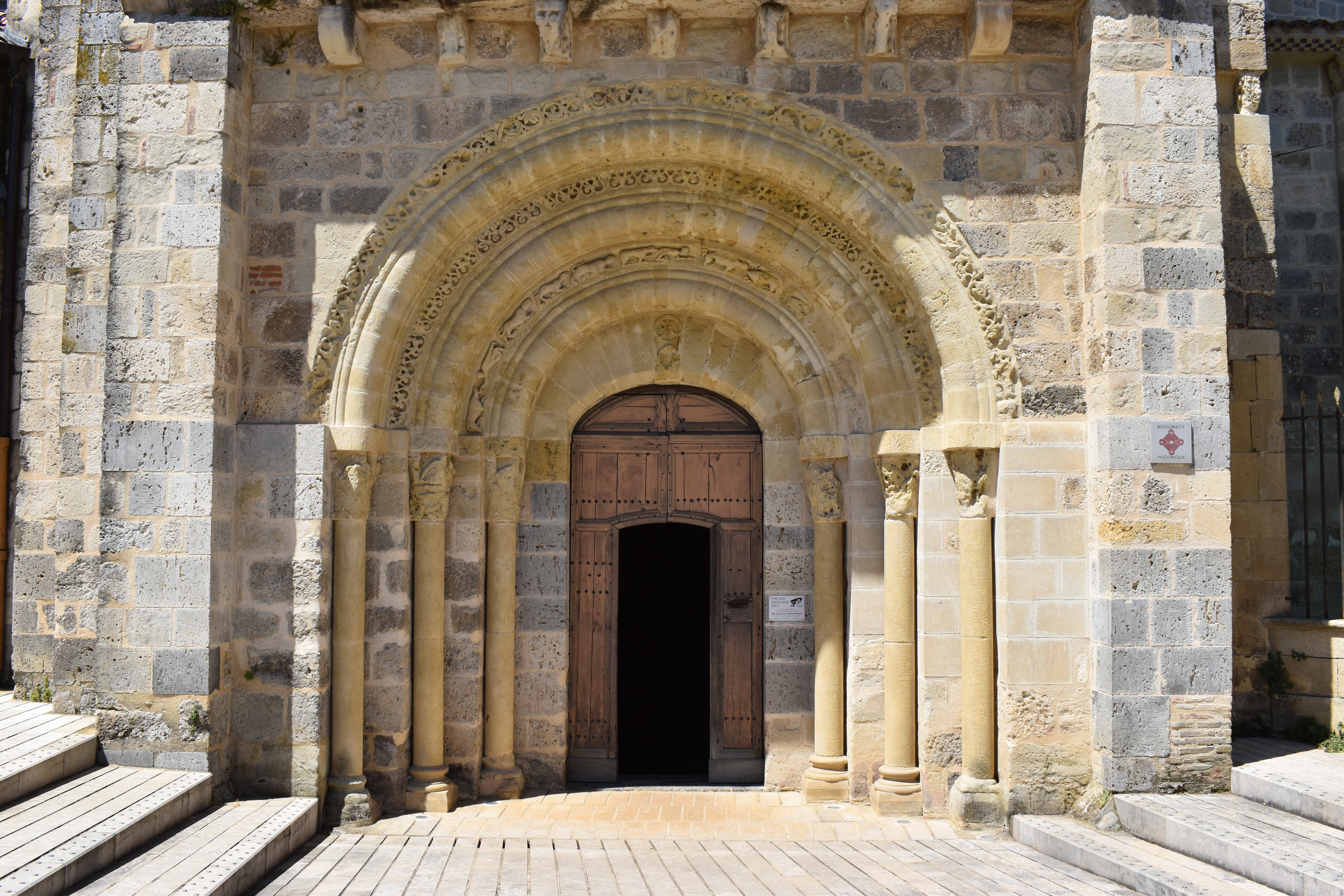 On accède au croisillon sud du transept par un large portail surmonté d’un clocher massif mais qui a perdu sa flèche au 19ème siècle. Les chapiteaux sont très abîmés mais on voit toujours sur les archivoltes des décors végétaux et une file de personnages et d'animaux.