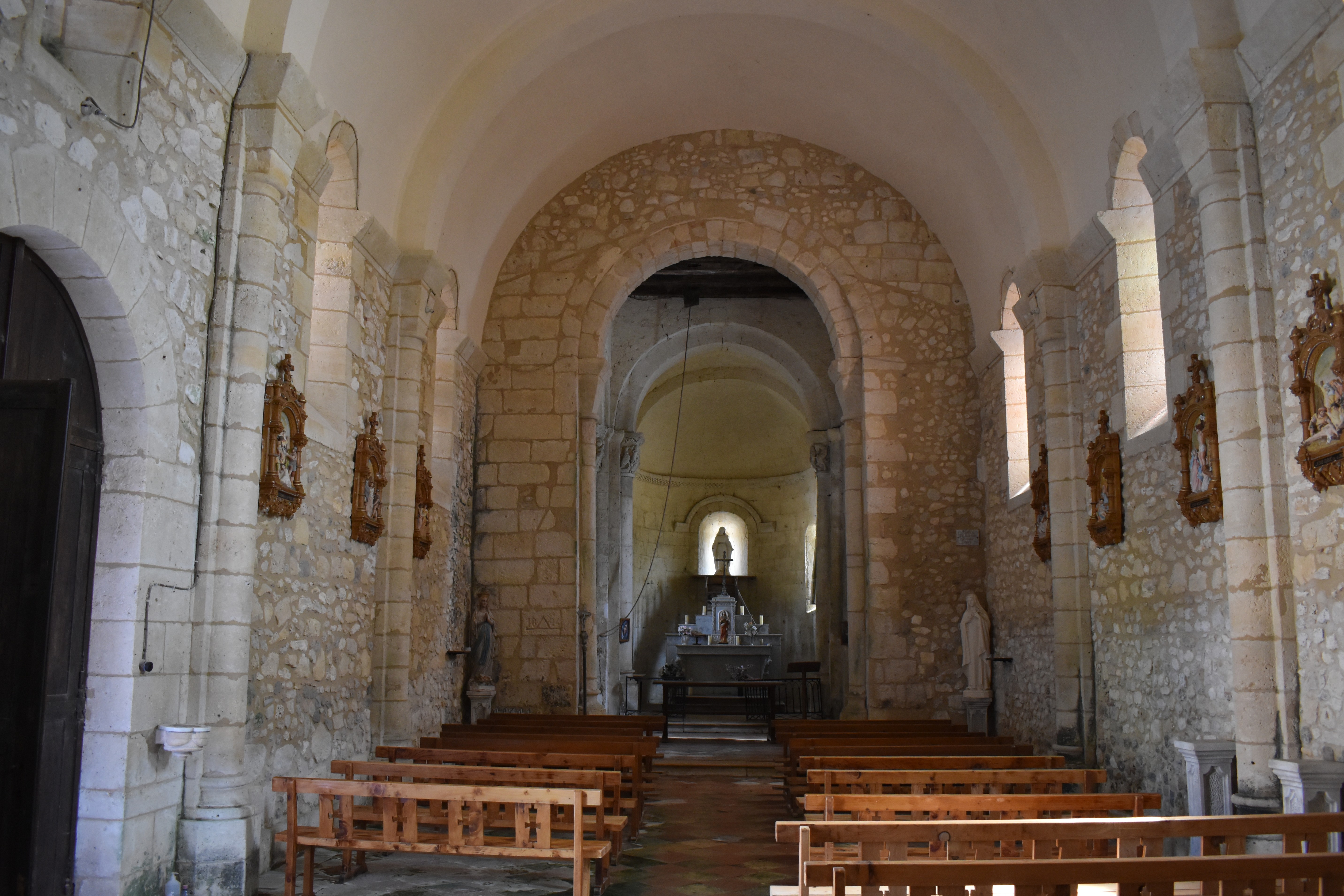 L’abside et l'avant-chœur sont voûtés en pierre alors que la nef, plus tardive, est voûtée en briques. Ils sont décorés par un cordon de billettes et d’entrelacs.
