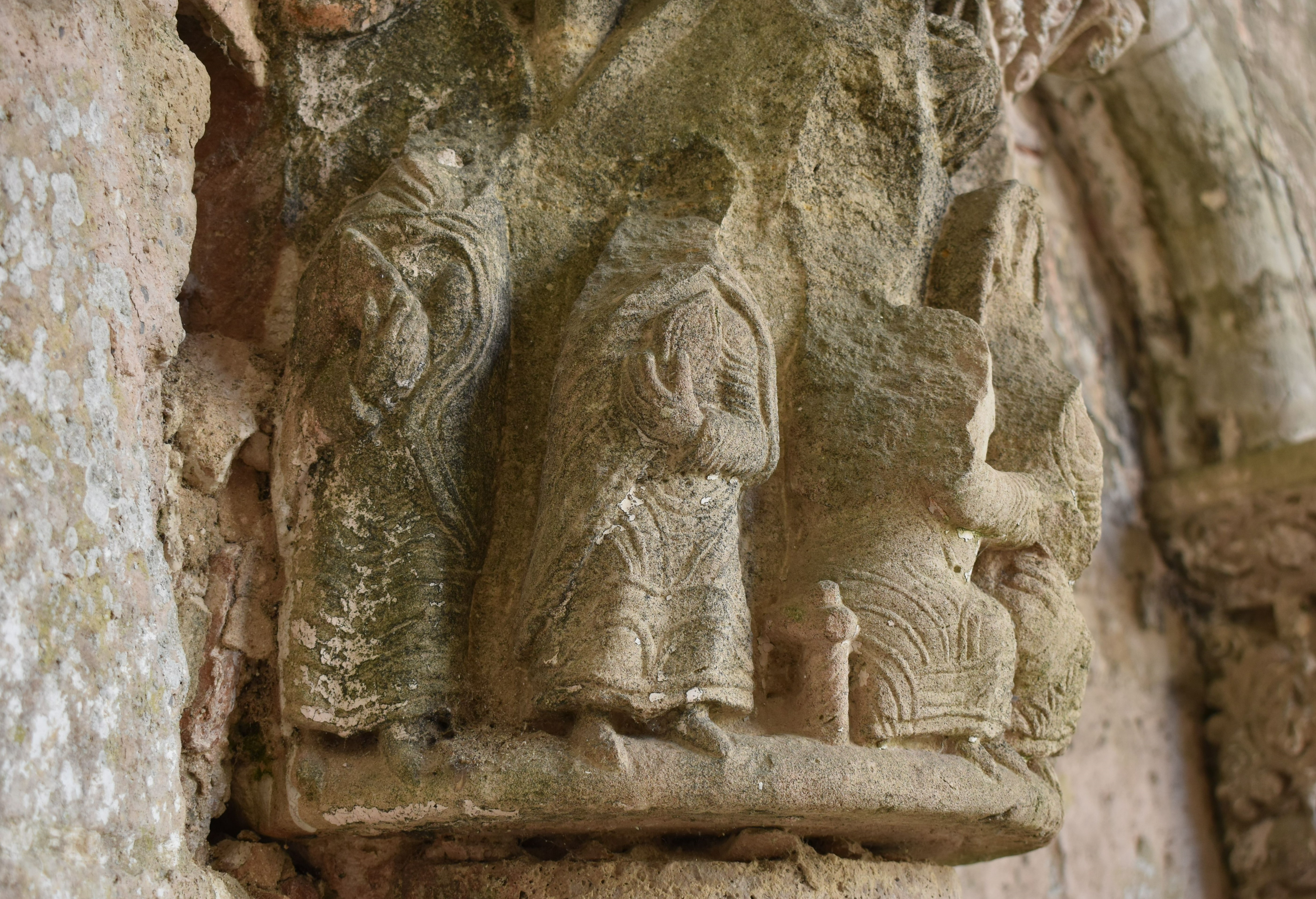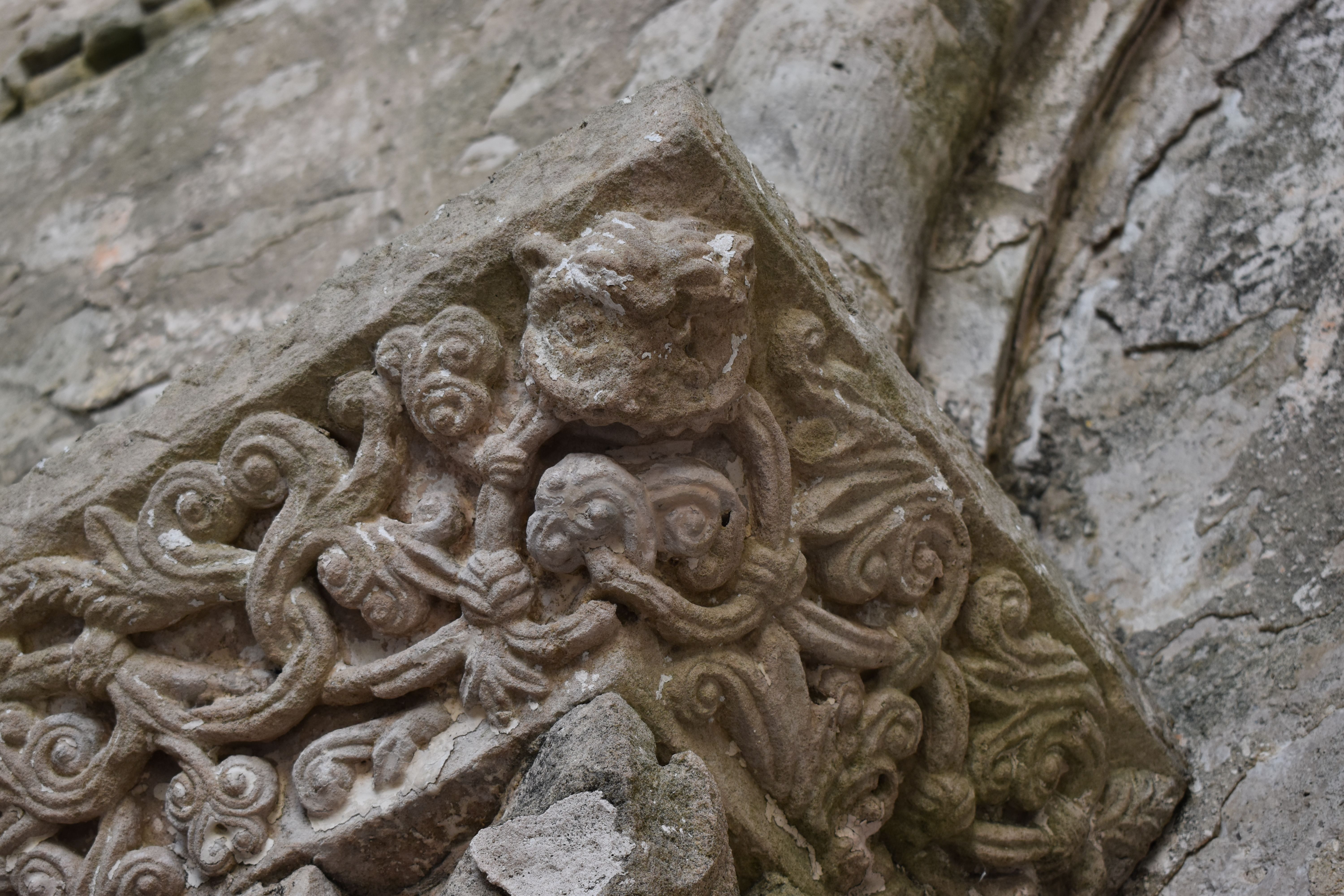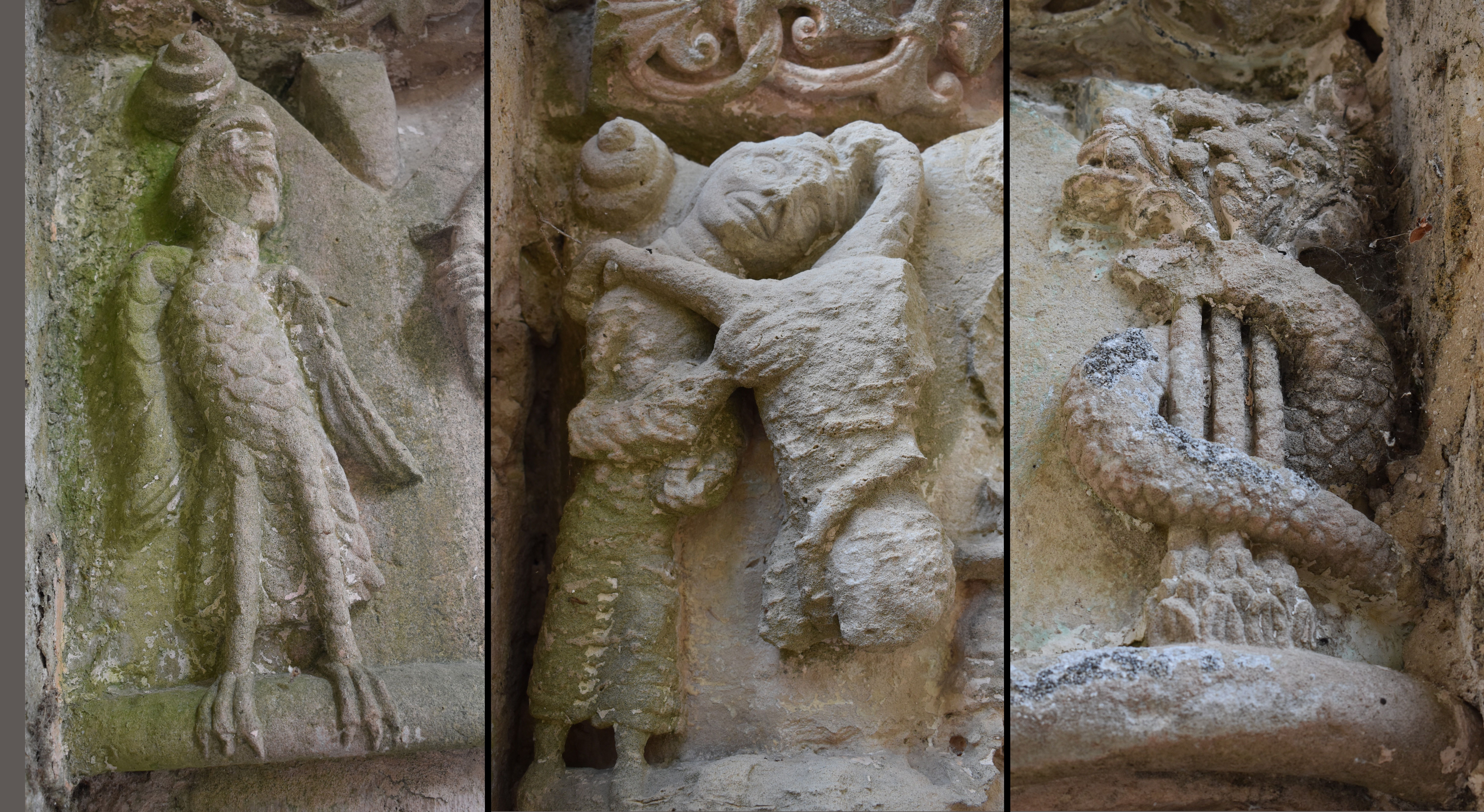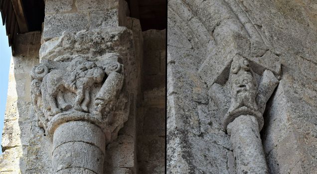 Sont également présents des figures animales ou végétales et des têtes de personnages. Les tailloirs sont décorés de motifs végétaux (palmettes, rinceaux, entrelacs, grappes de raisin…) dont certains sortent de bouches de têtes monstrueuses.