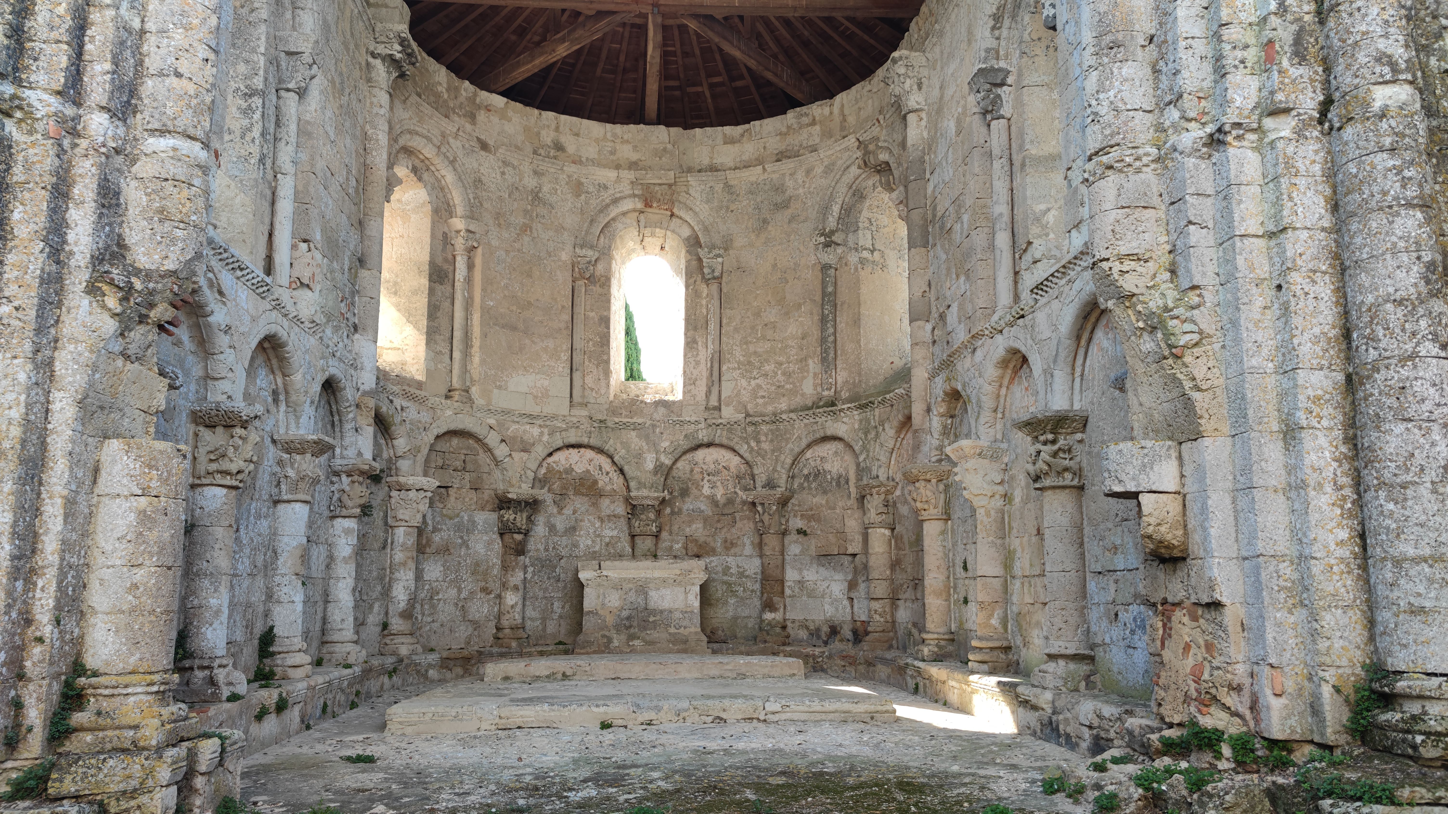 Une arcature en plein cintre contenant douze arcades fait tout le tour du chœur. L’autel est adossé au fond de l’abside. Un cordon de billettes sépare le premier niveau du second qui comprend cinq fenêtres décorées de colonnettes ornées de chapiteaux.