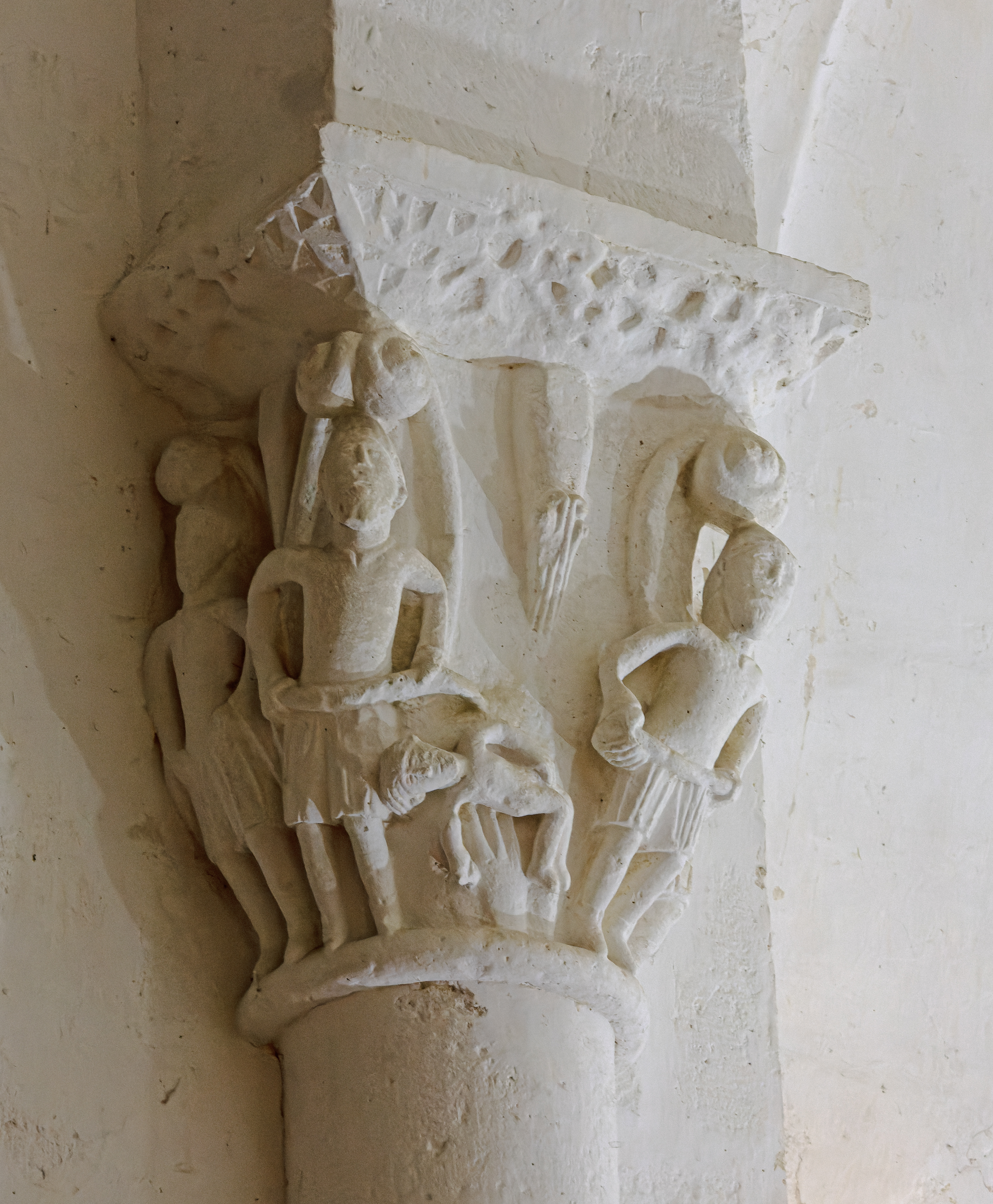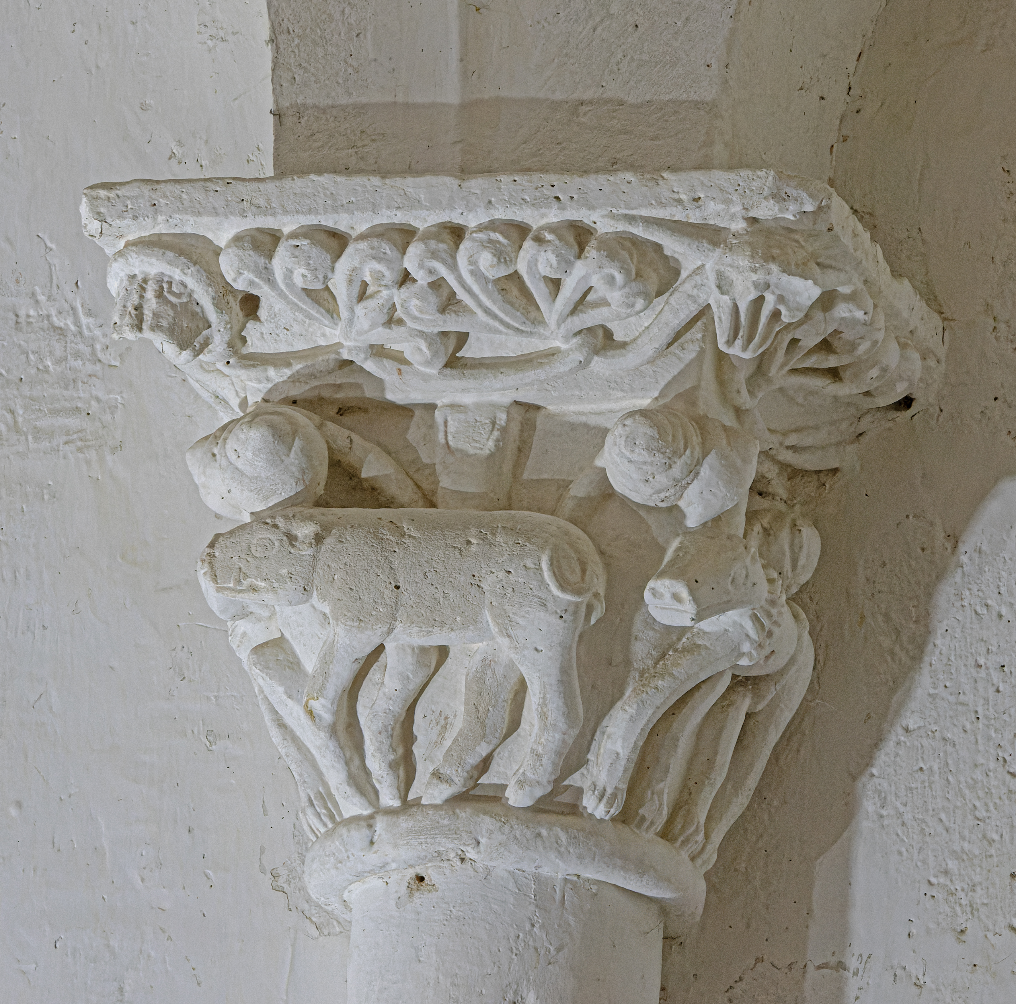 Les chapiteaux de l’église sont pour la plupart historiés et représentent des scènes bibliques (le sacrifice d’Abraham, le combat de David et Goliath et une barque portant des pêcheurs), ainsi que des figures animales ou des feuillages.