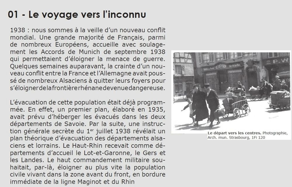 Quelques 600 000 Alsaciens doivent, en quelques heures, se préparer à abandonner leurs foyers et leurs biens et à partir pour une destination inconnue. Environ 450 000 sont évacués vers le Sud-Ouest, notamment en Dordogne, Haute-Vienne et Lot-et-Garonne.